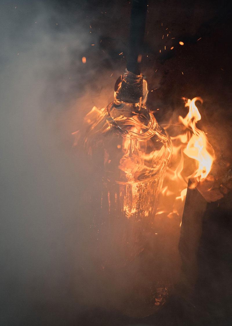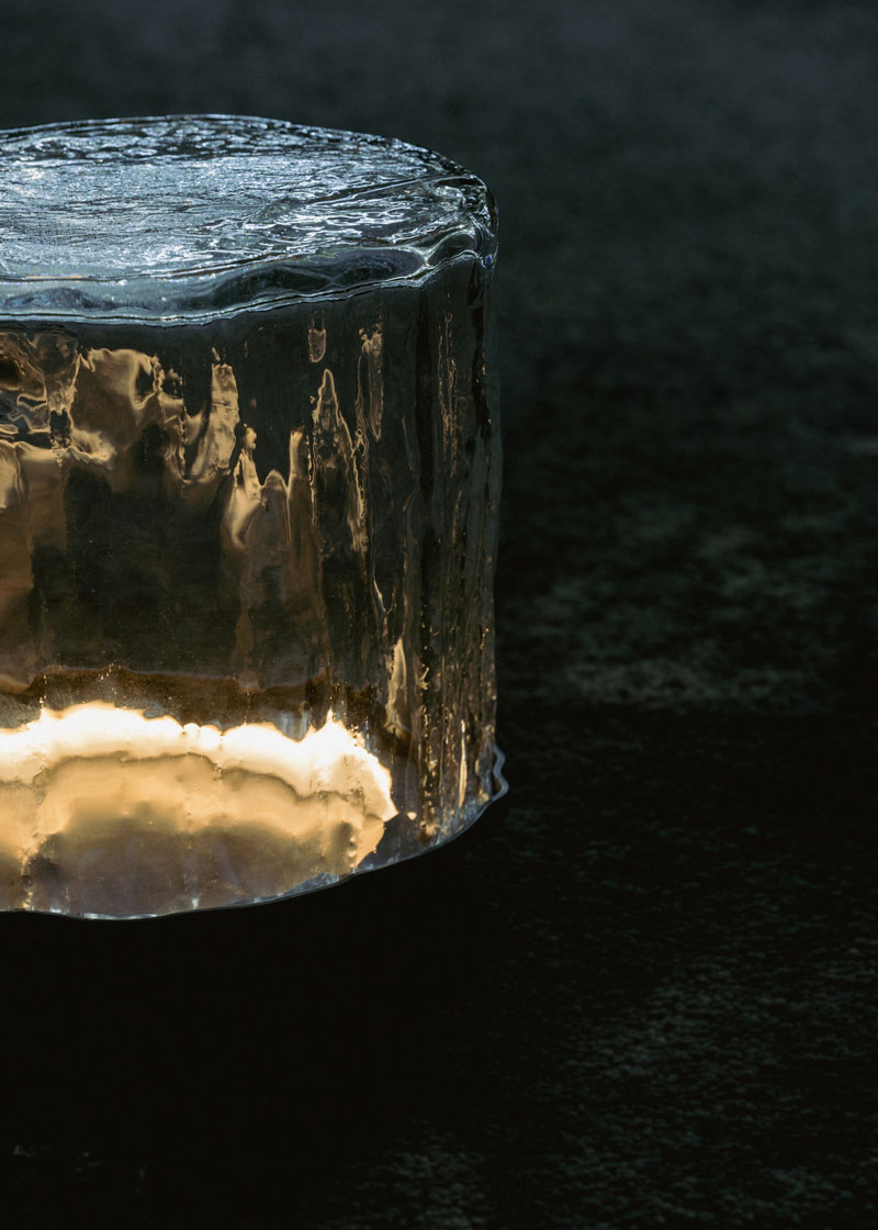 From the interplay of wood and glass, Cast from Tree takes on its luminous form, carrying the traces of life from the decayed trunks. Molten glass is blown into the naturally hollow wood, transforming its inner volume into a vessel of light—seemingly nurtured from within the tree.