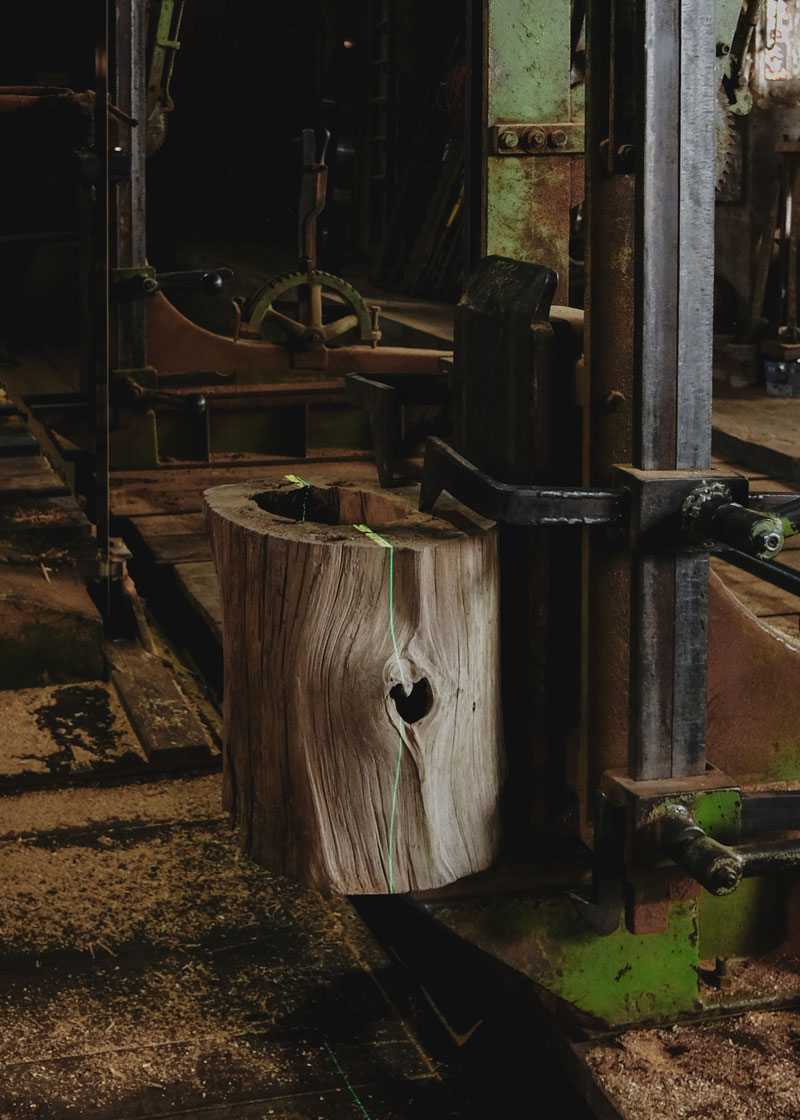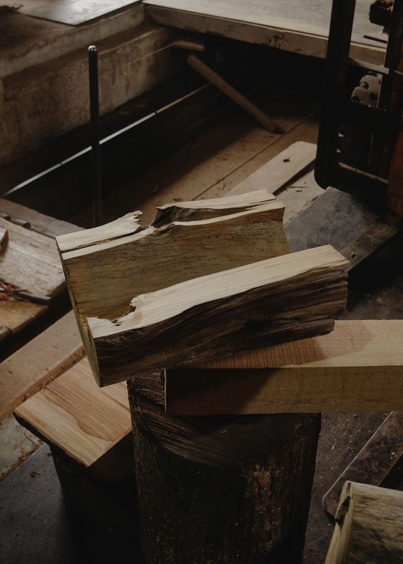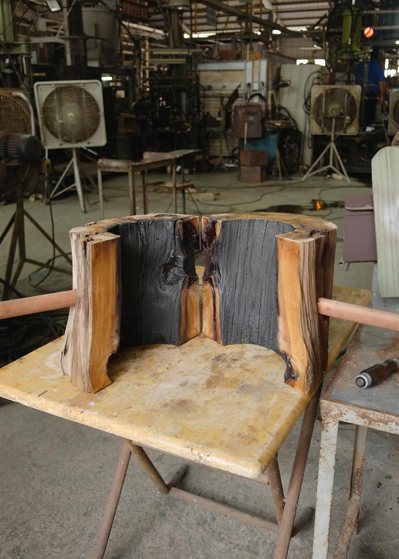 為尋找合適的木段,我們走訪位於新竹的正昌製材、蛋牌相思木 ,以及雲林的張家茂木材加工廠。最終選用柳杉、桃花心木與台灣紅檜,掏空其內部作為三種尺寸的模具,使各木種獨特的輪廓肌理,永久地凝結於玻璃之中。