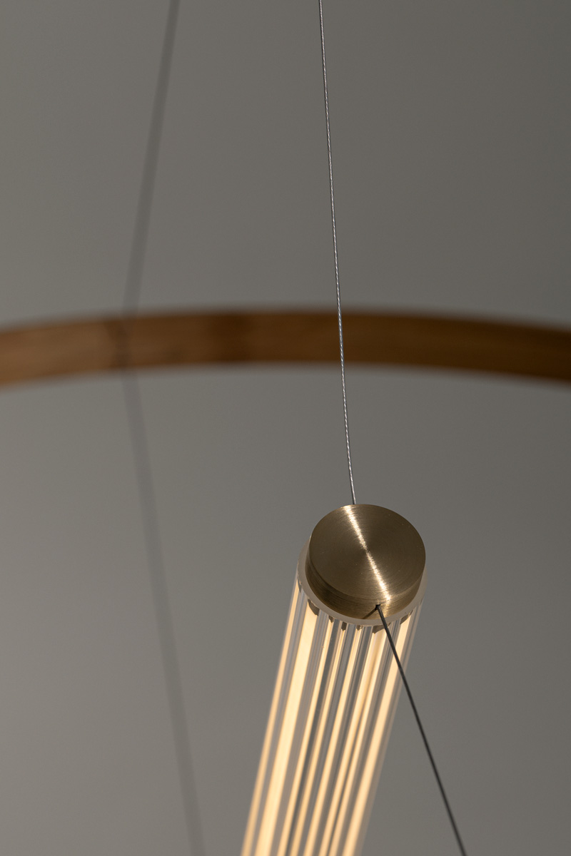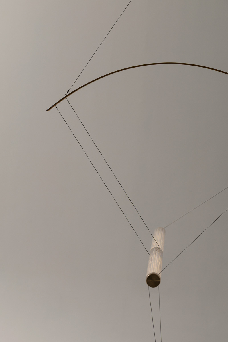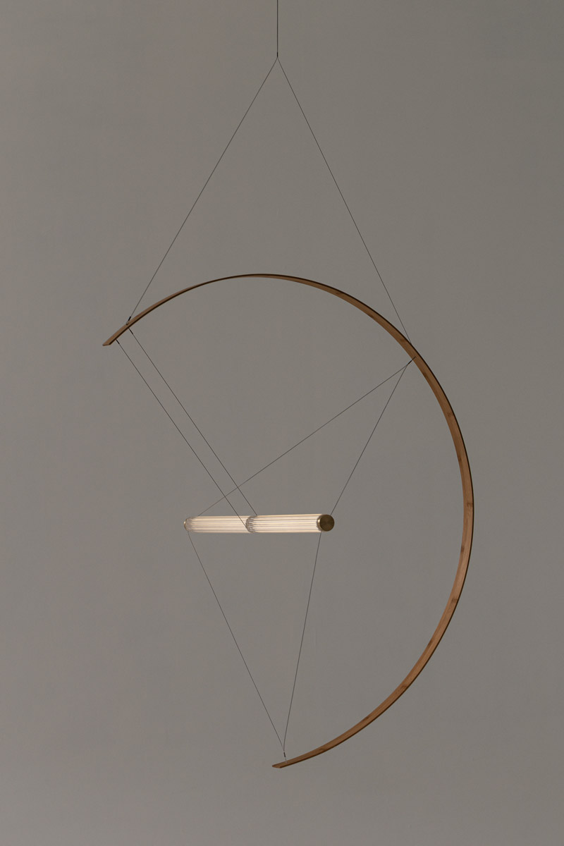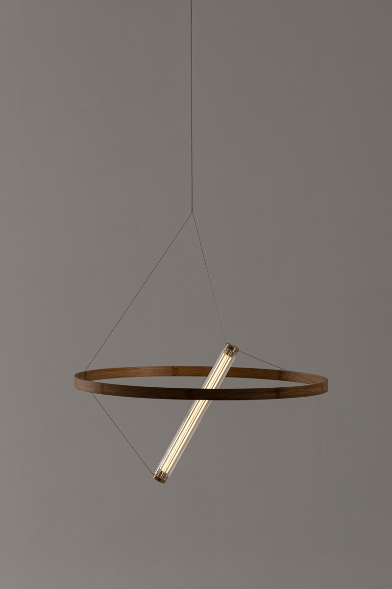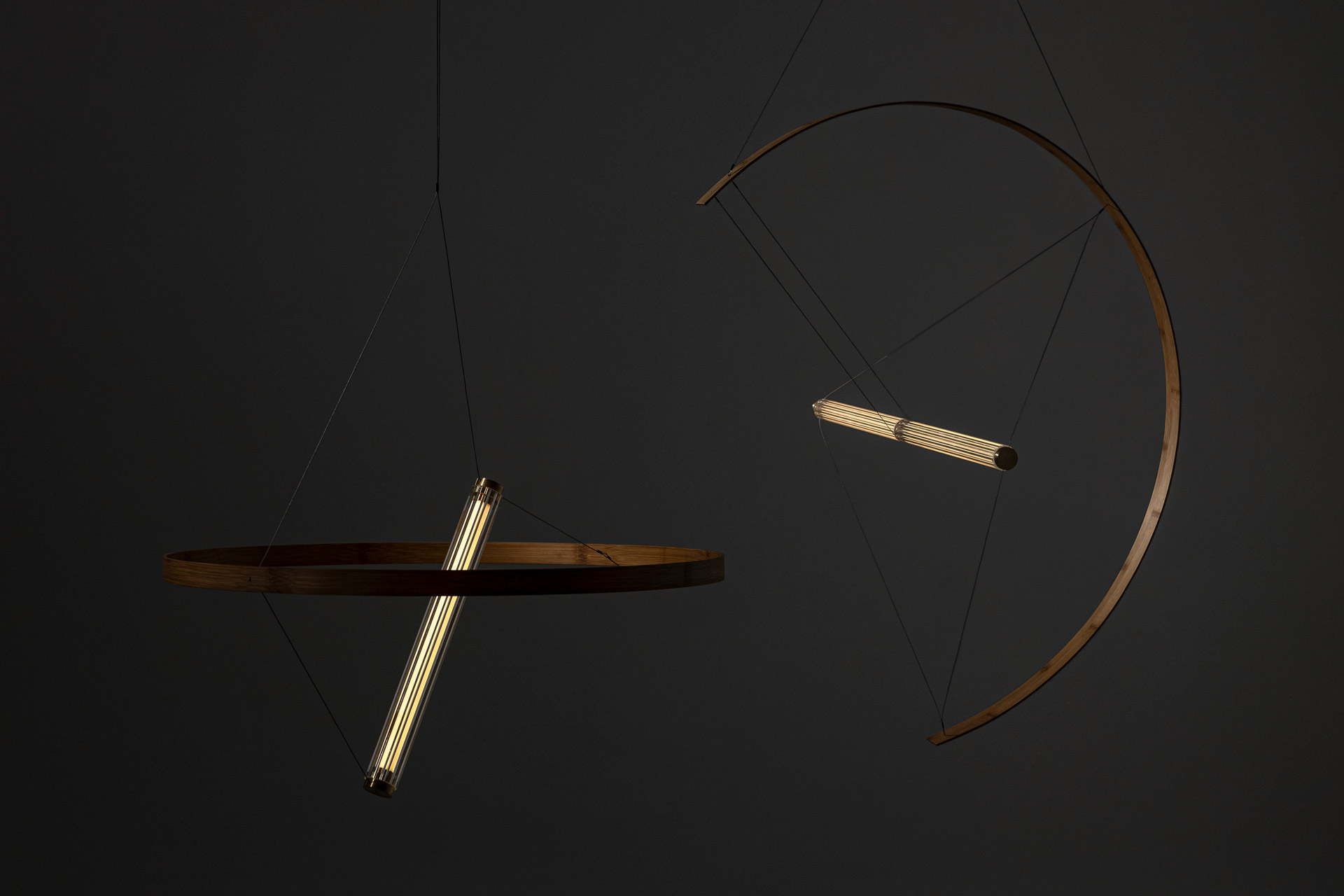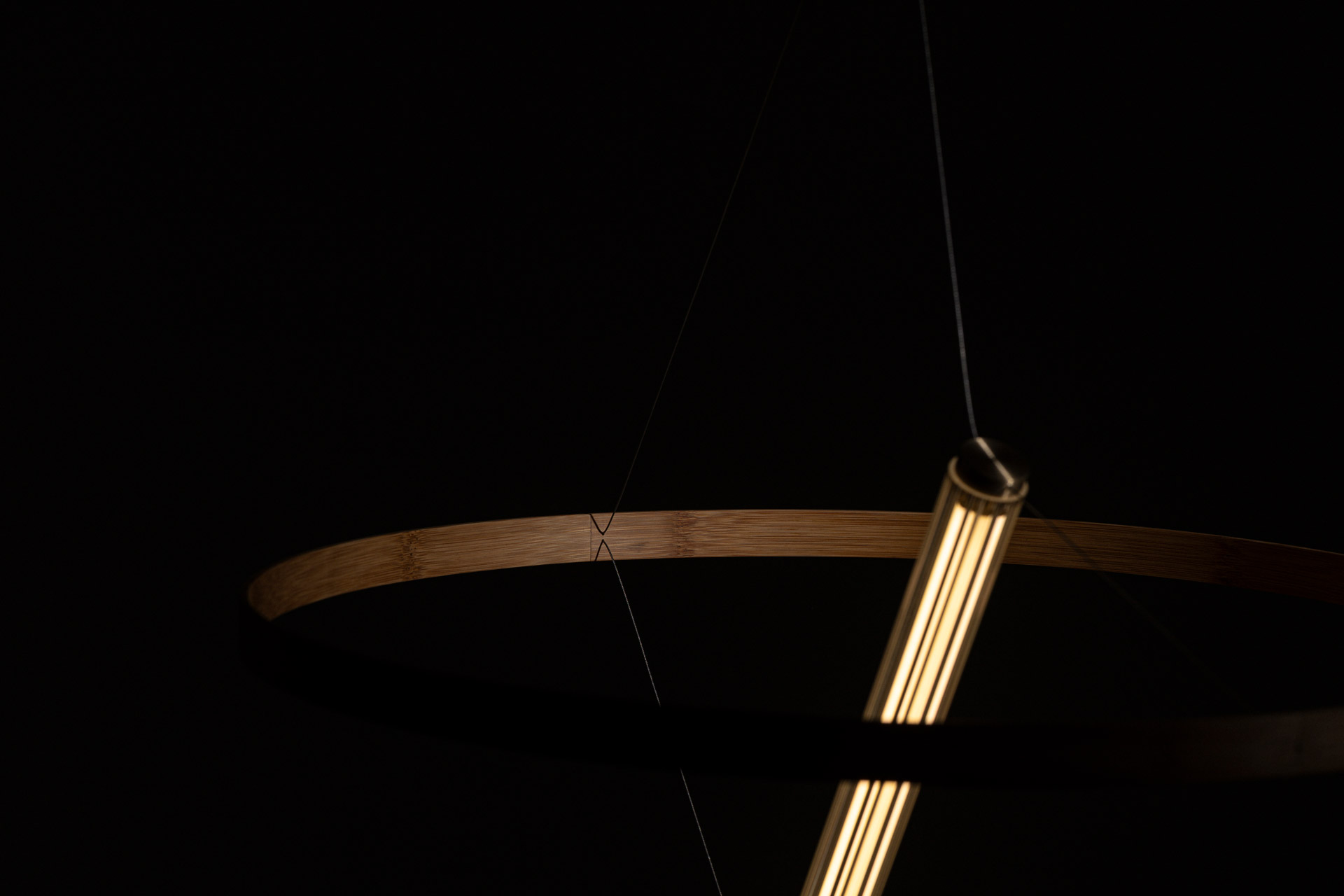 應用竹材的柔軟韌性,作品呈現出輕盈的平衡,其自然質地也因光線更顯溫潤。曲竹版本特別選用黃銅作為燈管五金,增添優雅而精準的氣息。