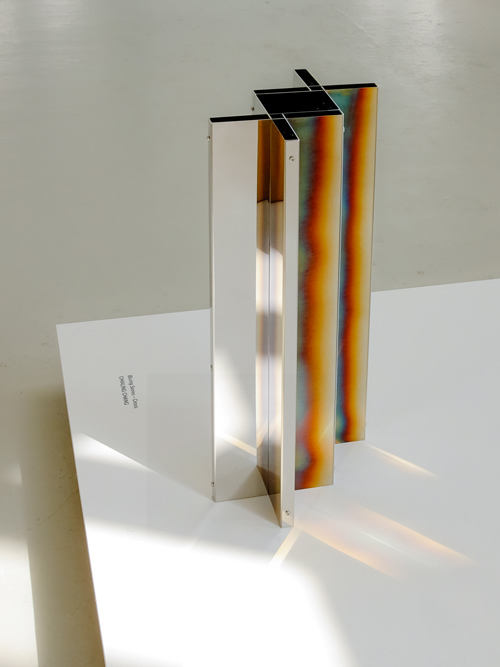 Circuit—Sequence.Bluing Series–Cross delves into the alchemy of heat treatment, where controlled thermal processes shift stainless steel’s surface hues from gold to red-brown, then purple to blue. Arranged in an intersecting pattern on a double cruciform structure, these tones create a mirrored symmetry, dissolving the boundary between solid and reflection, surface and depth, reality and perception.