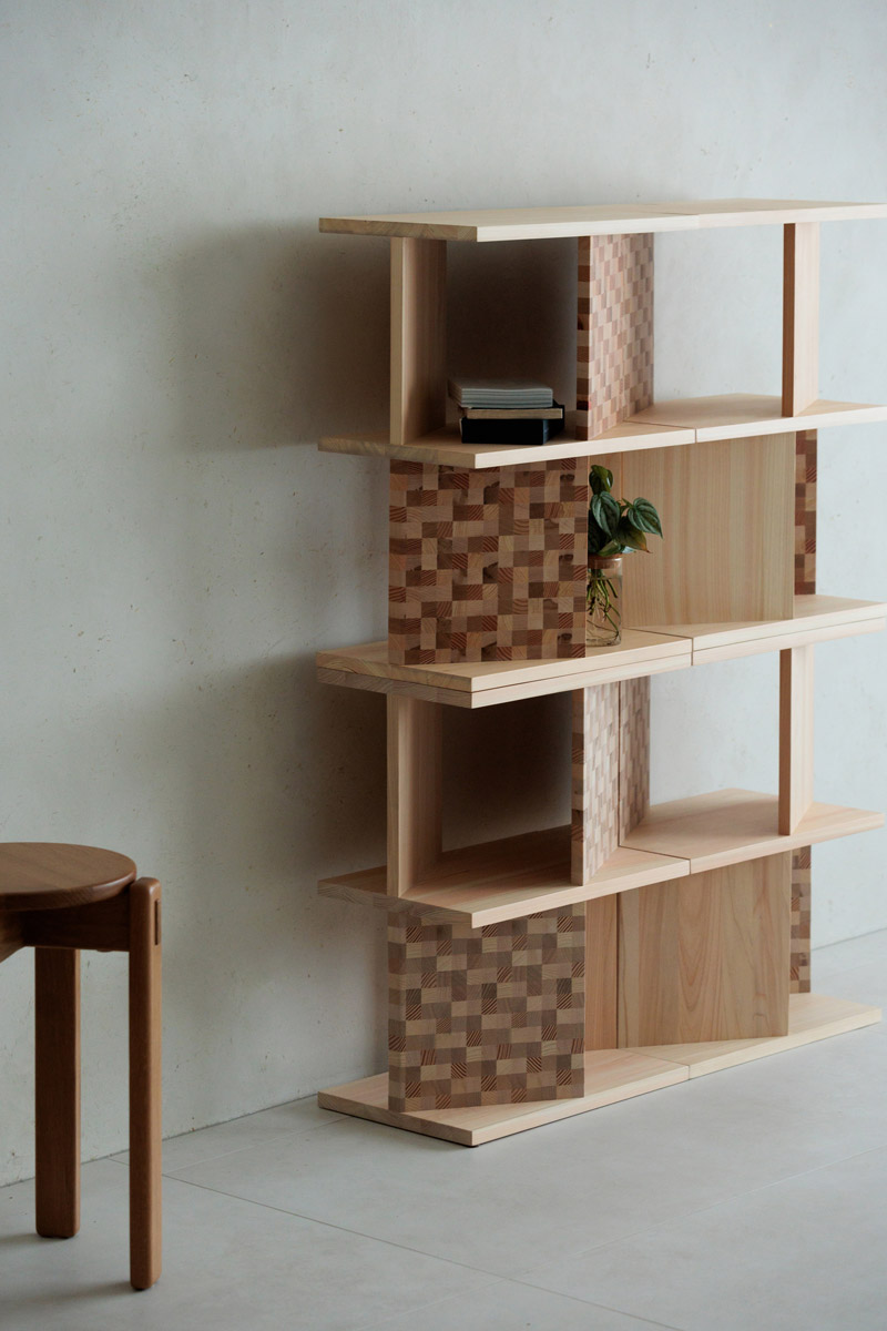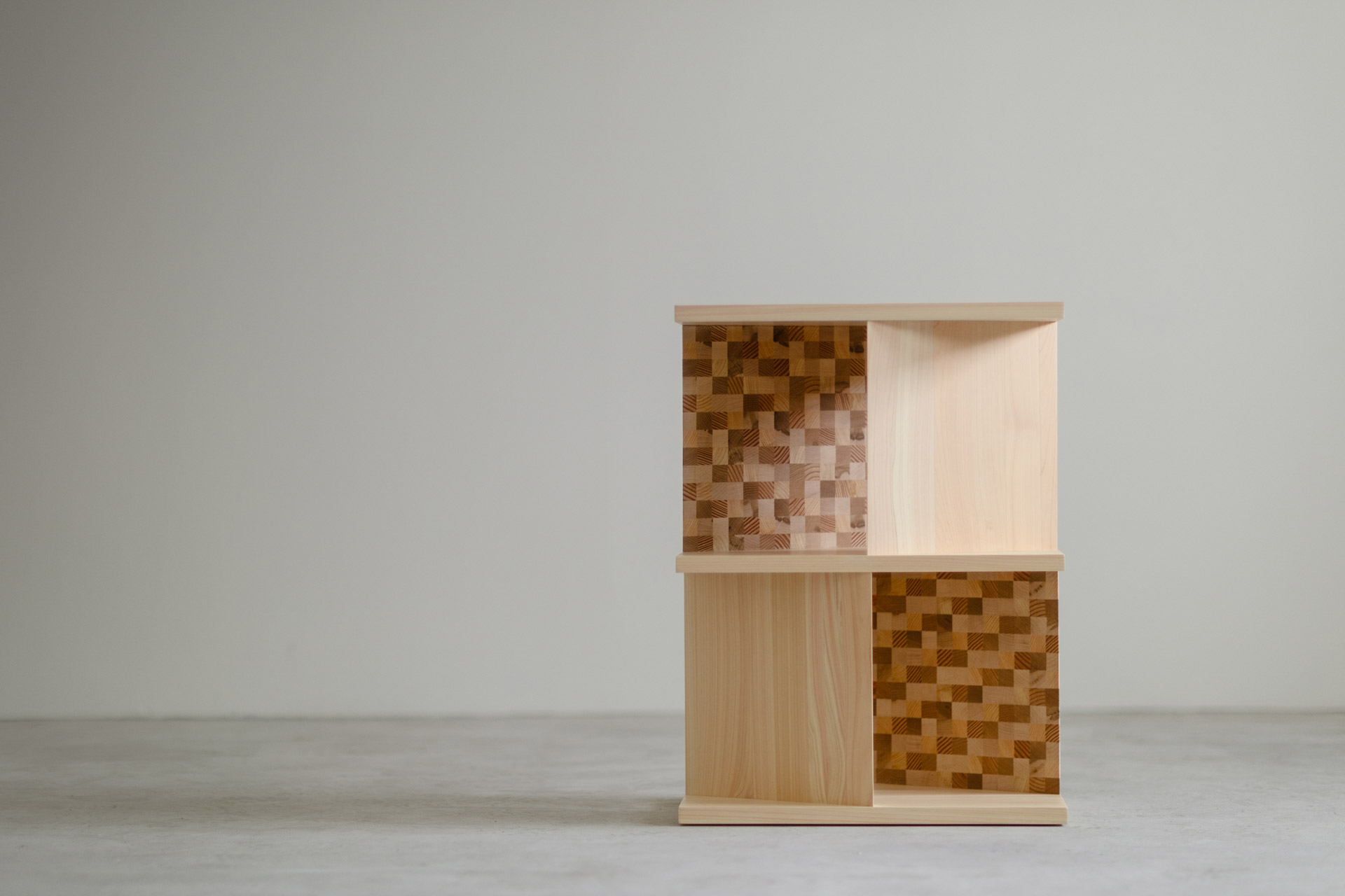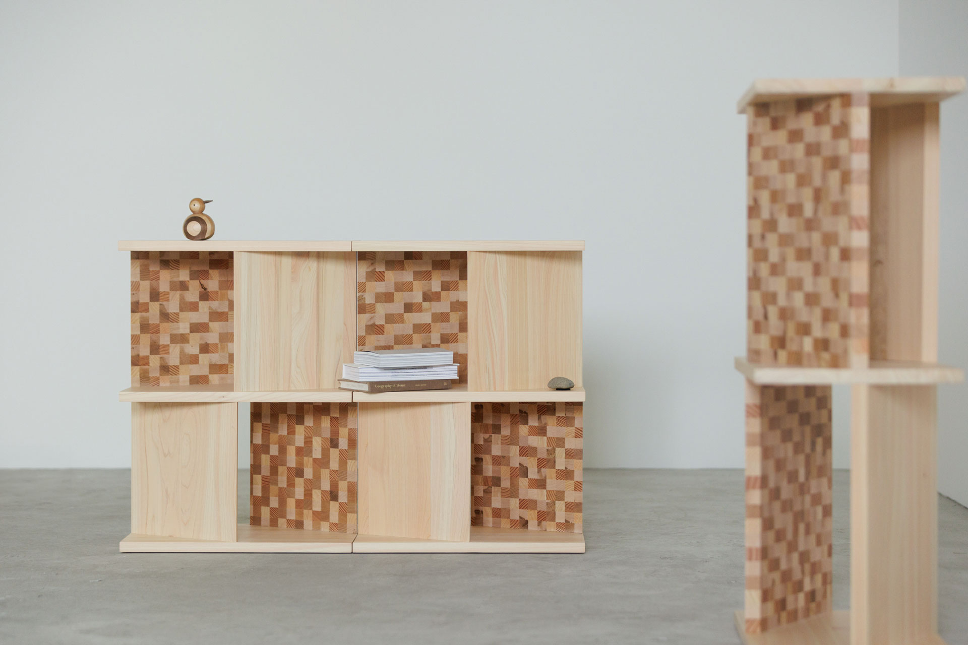 Derived from the Summer color palette of the wall-mounted wood mosaic Four Seasons, the Summer Series features a diagonal shelving structure. Mosaic wood panels and Japanese cypress are arranged in staggered layers, allowing the storage to shift naturally between function and display. When arranged side by side, the angled surfaces align seamlessly, creating a continuous flow of pattern.