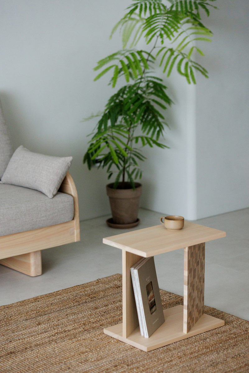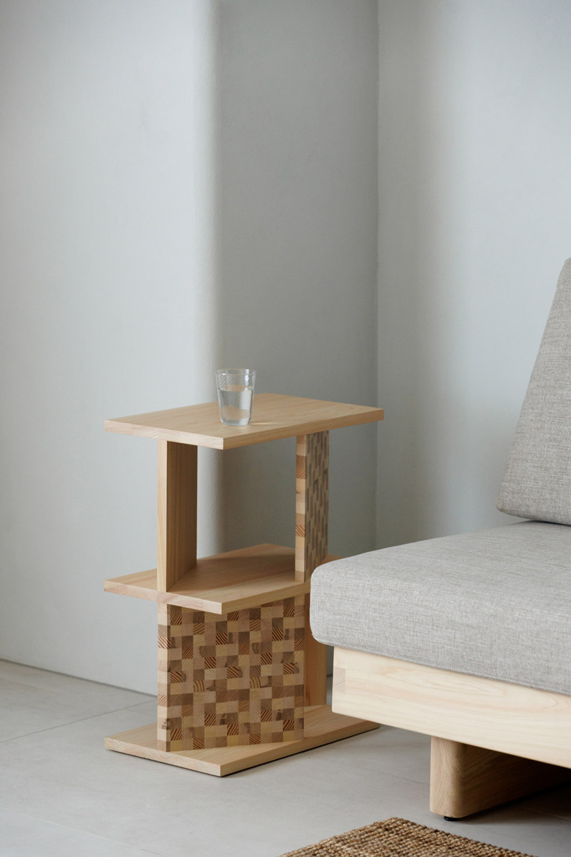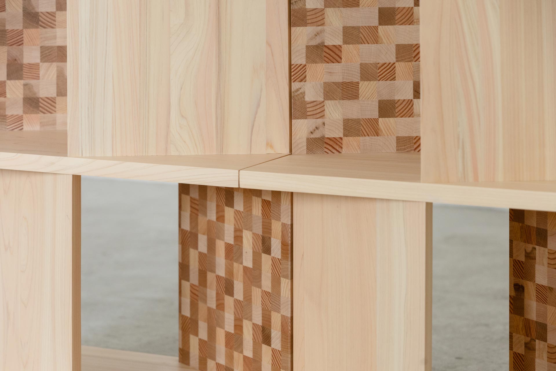Derived from the Summer color palette of the wall-mounted wood mosaic Four Seasons, the Summer Series features a diagonal shelving structure. Mosaic wood panels and Japanese cypress are arranged in staggered layers, allowing the storage to shift naturally between function and display. When arranged side by side, the angled surfaces align seamlessly, creating a continuous flow of pattern.